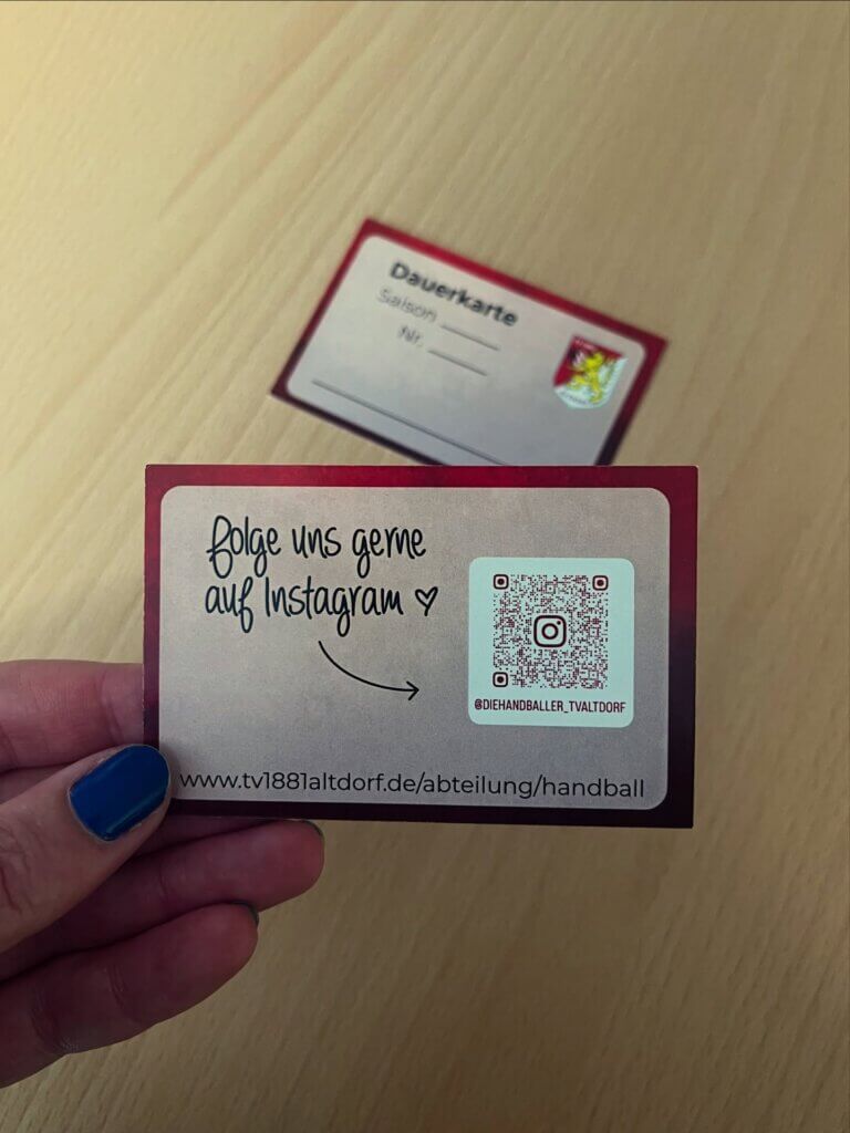 Ergänzt werden die Heimspielkarten durch neu gestaltete Eintritts- und Dauerkarten 🎟️❤️🖤. Auf der Rückseite ein QR-Code, der direkt zum Instagram-Account des Vereins führt 📲. Der Verein bleibt digital nur einen Scan entfernt.
