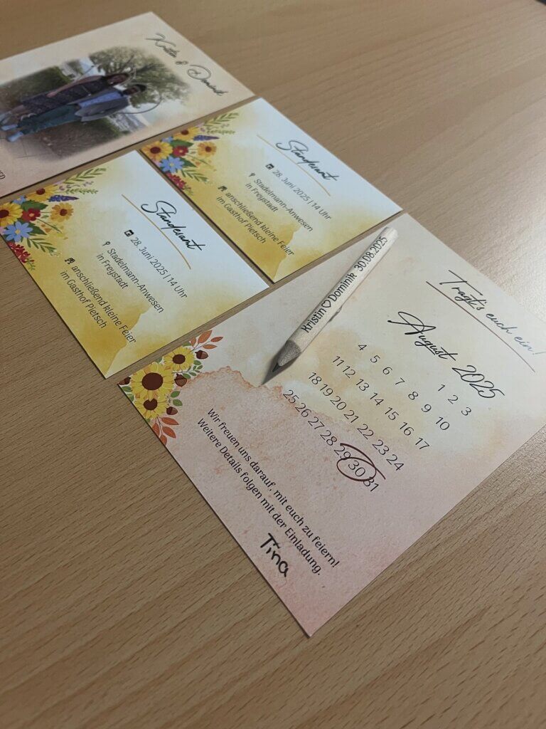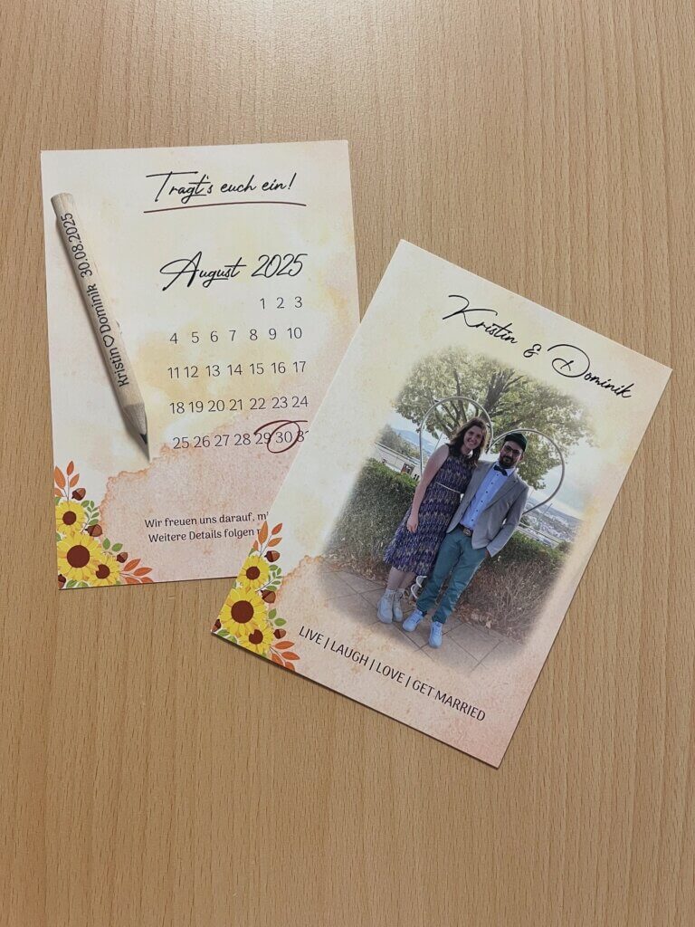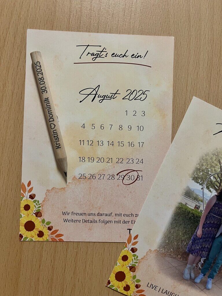 Die Save the Date Karten sollten nicht nur informieren, sondern gleich Vorfreude wecken. Ein individuell bedruckter Bleistift mit dem Hochzeitsdatum und das passende Kalender-Design auf der Karte machen es leicht, den Termin sofort einzutragen – wortwörtlich.