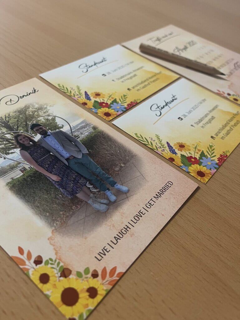 Ein liebevoll bearbeitetes Foto des Paares sorgt für Persönlichkeit und macht die Karte zu einem echten Hingucker.