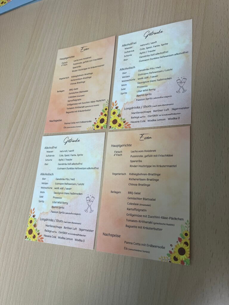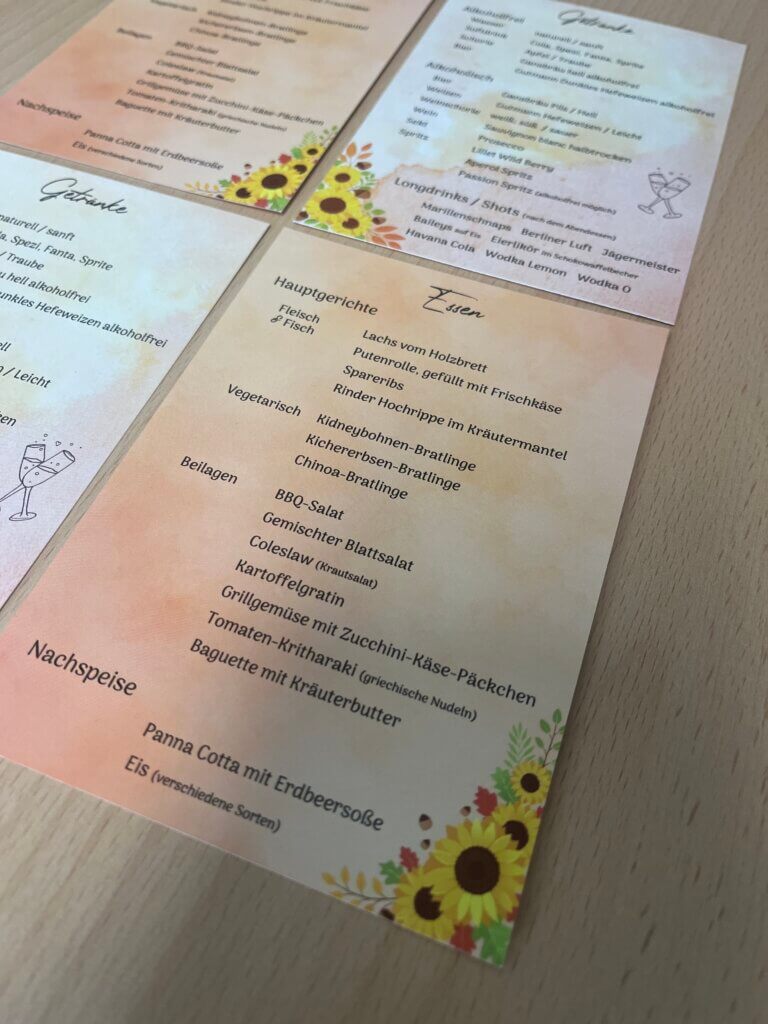 Auch am Hochzeitstag selbst spielte das Design eine große Rolle. Menü- und Getränkekarten wurden passend zum Gesamtkonzept gestaltet, mit floralen Elementen und klarer Struktur.