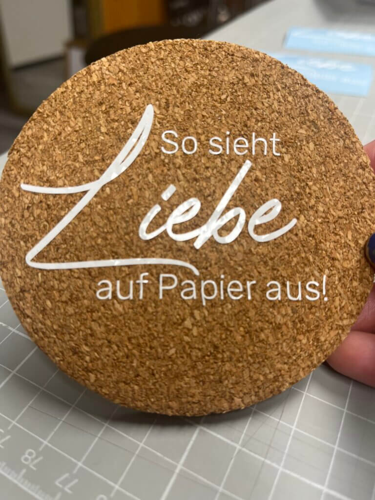 Ein schönes Beispiel dafür sind meine Kork-Untersetzer, die ich mit hochwertiger, weißer Plottfolie individuell veredle.